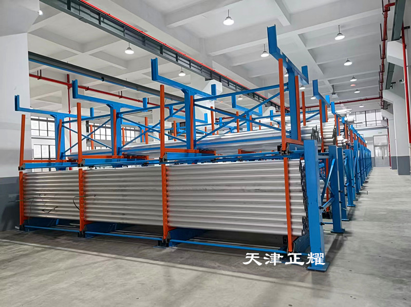 管材放置架由多層伸縮懸臂組成,每一層懸臂都可以獨(dú)立操作,互不干擾。這種設(shè)計(jì)不僅提高了空間利用率,還使得管材的存放更加靈活多樣。每層懸臂不僅能單面存放管材,還能雙面使用,進(jìn)一步增加了存儲容量。在多層懸臂的支撐下,管材可以垂直堆疊,避免了傳統(tǒng)平面存放方式下的占地面積大、查找困難等問題。